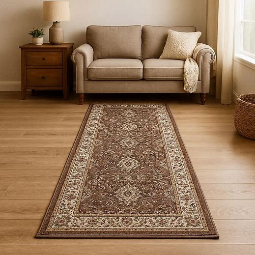 Ανανεώστε τον χώρο σας με αυτόν τον κομψό κλασικό διάδρομο σε ζεστές καφέ και μπεζ αποχρώσεις. Το διακριτικό του σχέδιο με συμμετρικά μοτίβα και περίτεχνο πλαίσιο προσδίδει αίσθηση πολυτέλειας και αρμονίας, ιδανικό για σαλόνια, διαδρόμους ή εισόδους.