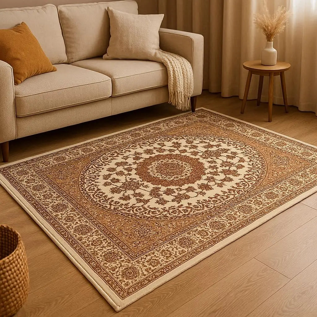 Αναδείξτε τον χώρο σας με αυτό το κομψό κλασικό χαλί σε μπεζ-καφέ αποχρώσεις. Ο διαχρονικός σχεδιασμός με περίτεχνα μοτίβα στο κέντρο και στην περίμετρο δημιουργεί μια αίσθηση ζεστασιάς και πολυτέλειας, ιδανική για σαλόνι, τραπεζαρία ή γραφείο.
