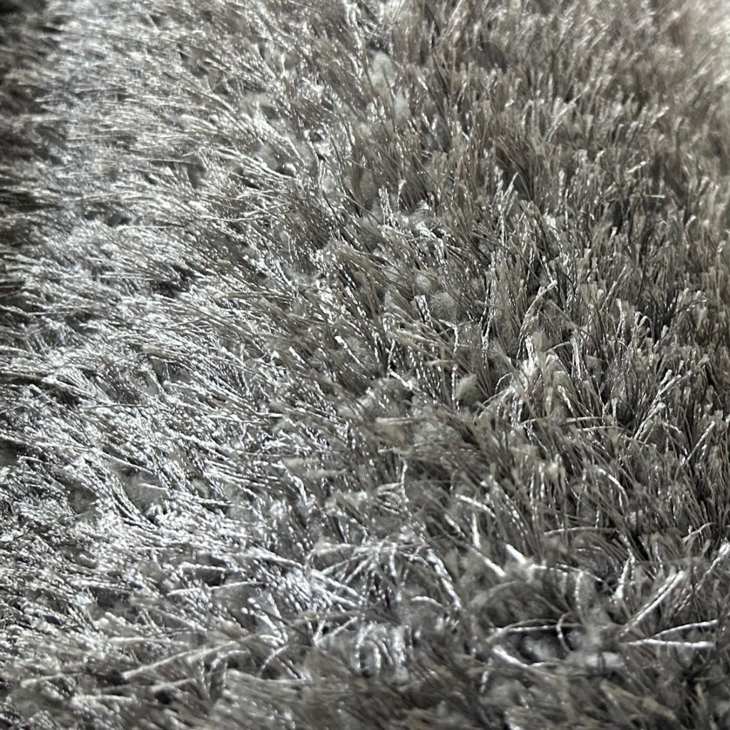 Γκρί shaggy χαλί με εξαιρετικά πυκνή και αφράτη υφή, που χαρίζει μοναδική αίσθηση απαλότητας στο πάτημα. Οι ίνες του έχουν μεταλλική λάμψη, προσθέτοντας διακριτική πολυτέλεια και ζεστασιά σε κάθε χώρο.